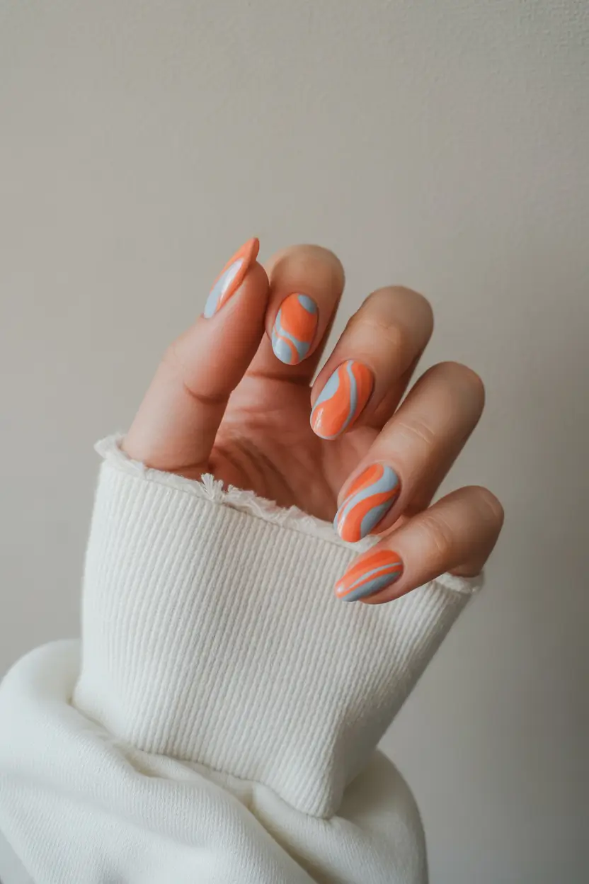 Abstract swirls always return every spring, but this version feels especially wearable thanks to muted peach paired with airy blue curves. The almond shape adds elegance, while flowing lines create movement that feels light and modern rather than graphic. It fits perfectly into simple gel nail art ideas for anyone who wants something trendy yet calm enough for everyday life.