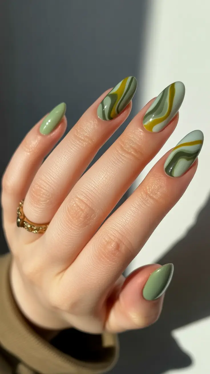 Green continues to dominate spring nail inspo, and this marbled almond manicure proves why. Layers of sage, olive, and muted chartreuse flow together in soft waves that resemble natural stone or leafy movement. The result feels classy and slightly artistic, perfect for anyone wanting color without brightness.