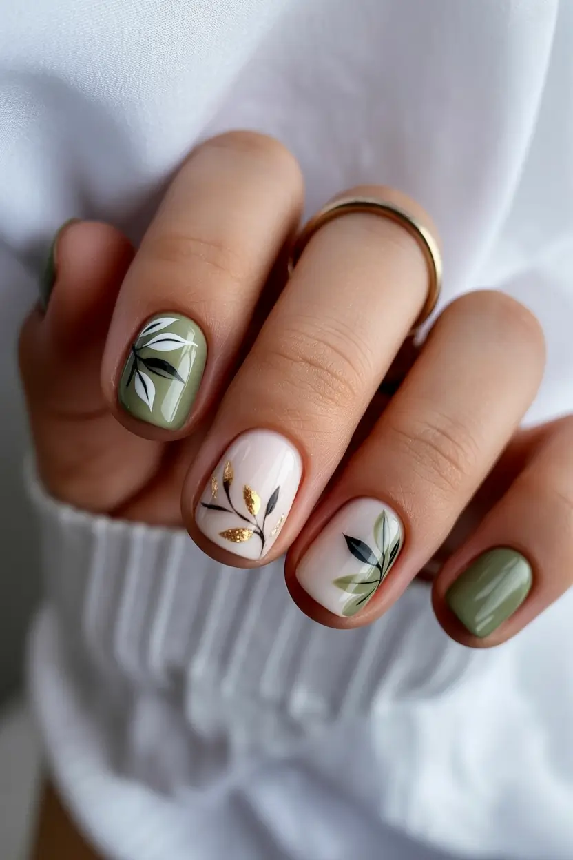 I usually work with shades like Essie Win Me Over or Olive & June WKF for that soft green base. Leaf details are easiest with gel paint and a fine liner brush, layering lighter and darker tones for dimension. Nail artists often recommend working slowly with botanical designs instead of trying to finish in one stroke, and that advice genuinely changed my results at home.