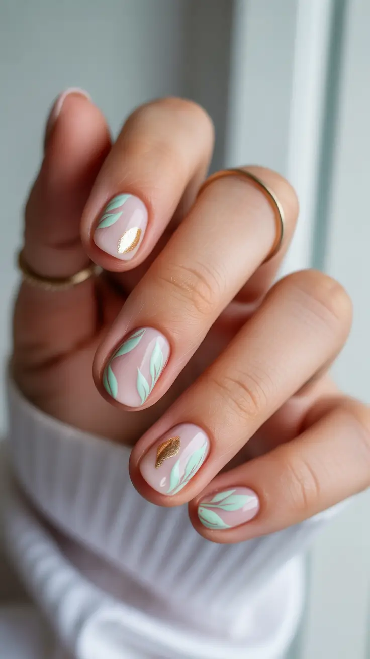 Minimal Pastel Leaf Art On Short Natural Nails