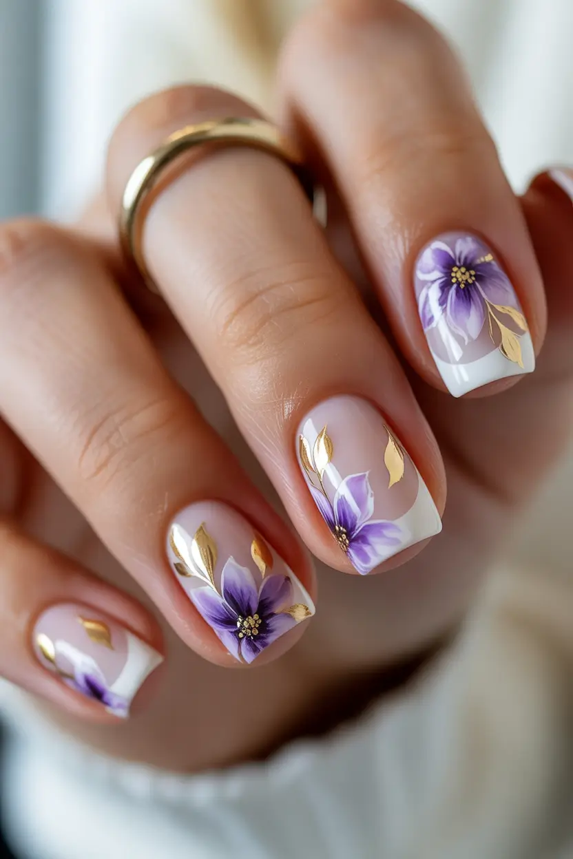 Classy Floral French Tips With Soft Purple Accents