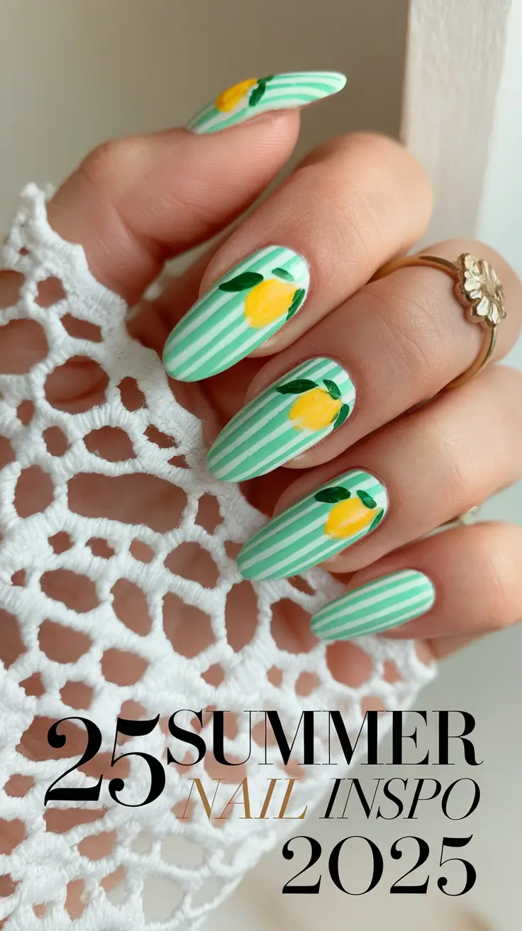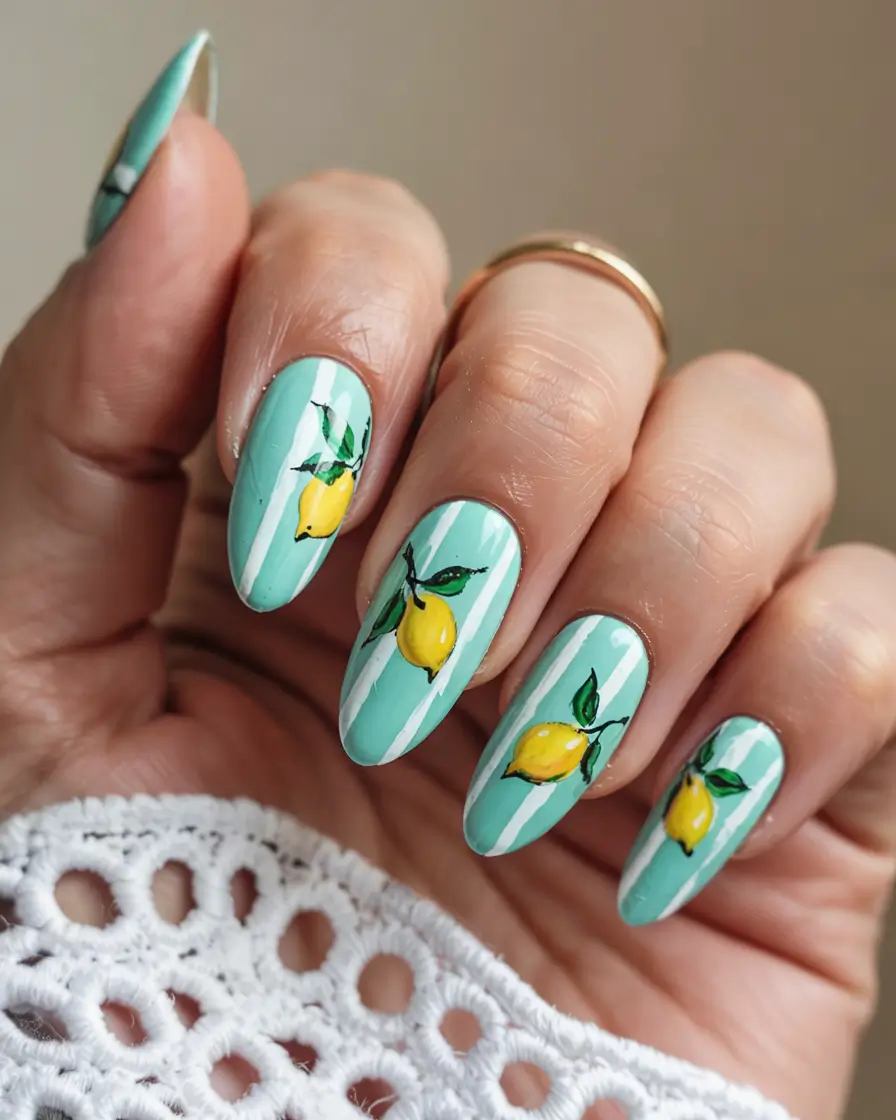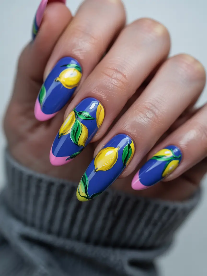 A colorful manicure features handmade lemons with green leaves on a bold blue base that looks juicy and vibrant. Gel polish creates a reflective finish, but pink effects along the tips meet the almond-shaped nails for a striking contrast. The detailed approach of this design makes it an excellent choice for creative summer nail ideas in 2025. This style delivers the pure essence of fresh tree fruit, perfect for any summer event and celebration.