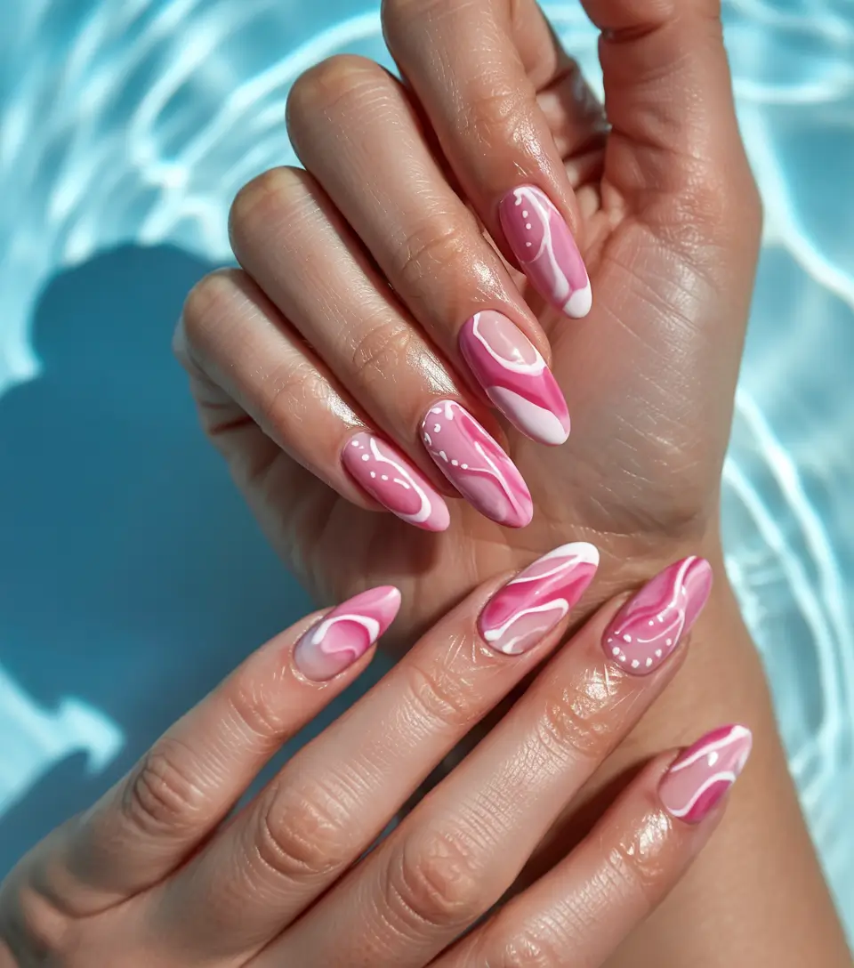 The playful almond shape combines pink and white swirls with white polka dots for a balanced summer design. A beach-ready look is created when gel polish is applied with a semi-transparent base for this design. This design suits people who want both colorful innovation and uncomplicated simplicity in their manicures. This design fits the preferences of people who like 2025 almond short simple looks and soft movement styles.