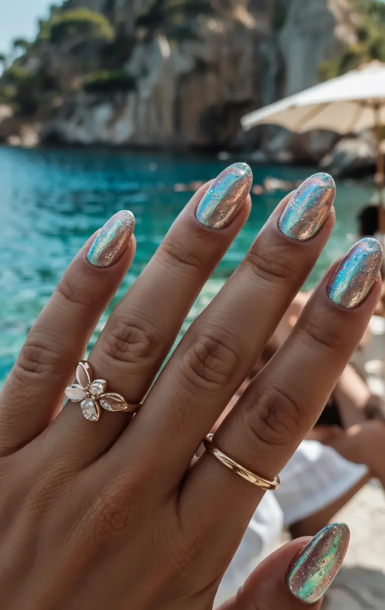 This gel manicure has a mirror-like aura finish with cool undertones of turquoise, rose and silver. Its rounded, short style provides visual appeal in the sunlight and requires minimal maintenance. Short nails in this dreamy style perfectly capture the shimmer of the ocean during beach days. Short nail enthusiasts will embrace this futuristic design as their perfect choice for a brilliant 2025 glow.