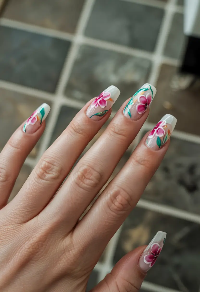 The Hibiscus Flower Square Set transports nail lovers to the tropics with hand-painted pink and magenta flowers on a clear base. White French tips with a clear base support the hand-painted flowers, which end in a high-gloss gel finish. The style strikes an excellent balance between contemporary style and sophistication suitable for everyday summer vacations. The 2025 square design creates nails that maintain their florality throughout the summer season.