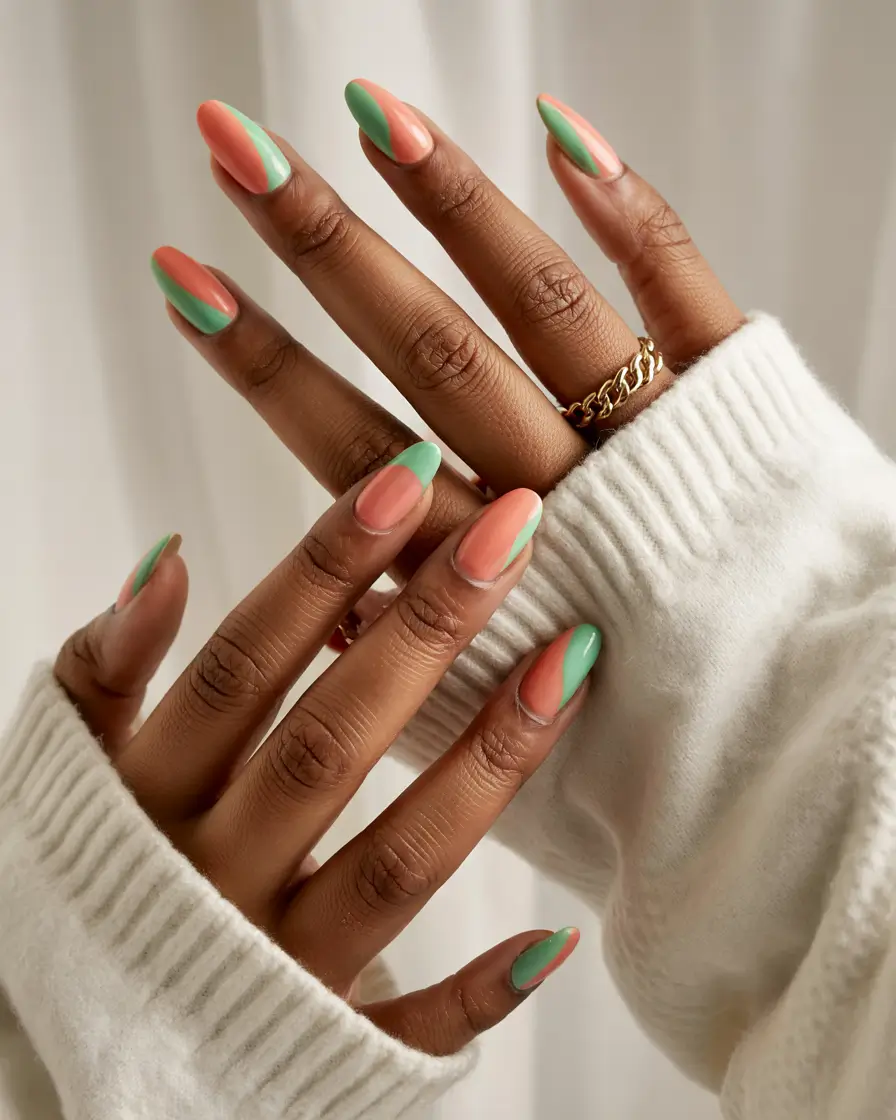 A shiny almond-shaped short nail features two effortlessly translucent blocks that pair mint with coral. The two-tone layout offers stylish design with a comfortable, natural wearability throughout the seasons. This attractive design works on different tones of dark skin because its bold colors stand out brilliantly. This design is for people who want simple nail art that makes a strong visual statement in the year 2025.