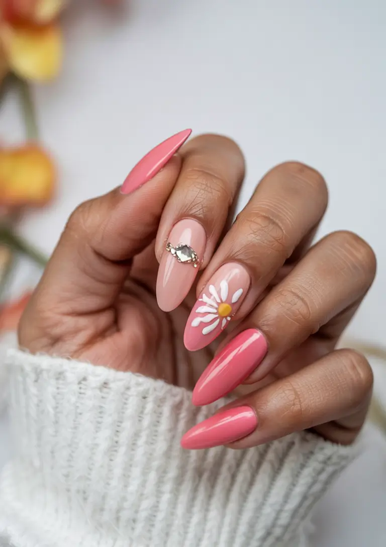 The romantic almond shape combines vibrant shades of pink with a pretty white daisy on one finger and a rhinestone band on another. The manicure has texture as the floral design has soft three-dimensional details that create a playful feel. This dazzling almond style creates a beautiful look suitable for all short dark skin tones in the year 2025. People with feminine tastes who prefer floral designs but still need some sparkle in their appearance should wear this nail style.