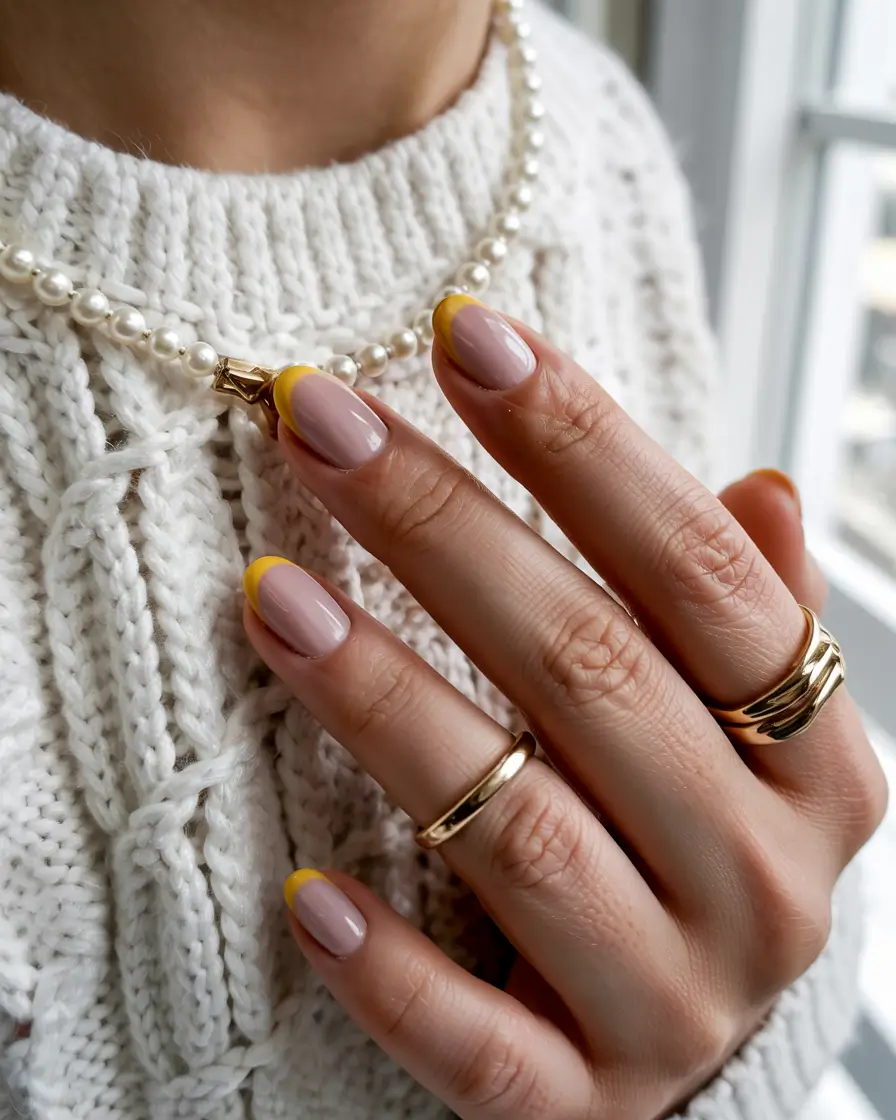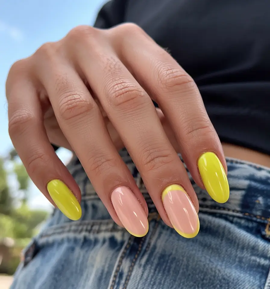 The elegant incarnation of French tips shines through its nude base while revealing a bright yellow tip. Wear this minimalist shape anytime and anywhere, as it offers everyday practicality or sophisticated sun-season appropriateness. People who want simple aesthetics with personal character in their nails should consider this nail design. A 2025 short manicure can easily incorporate subtle color with this method that avoids excessive ornamentation.