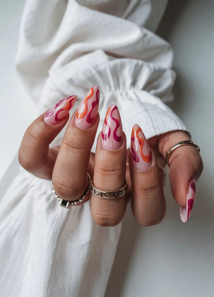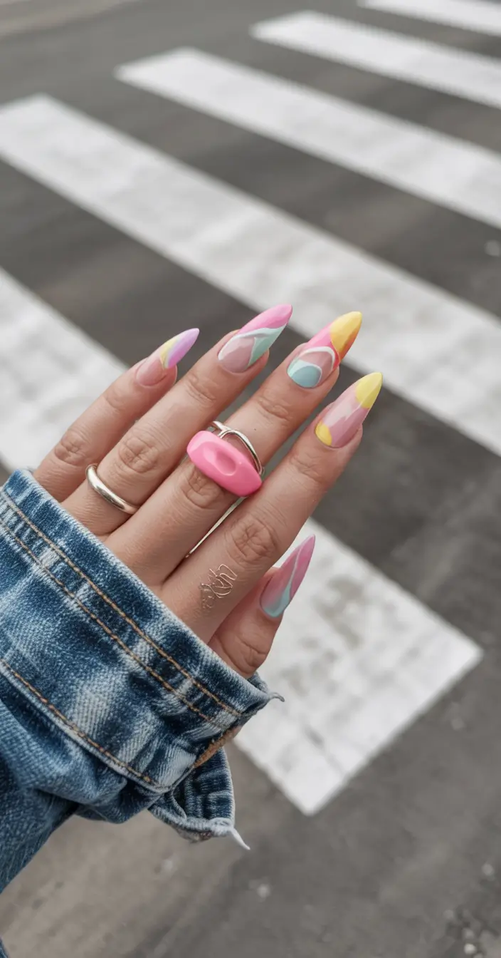 Pink, yellow, and pastel blue tones combine with clear nude to create a sophisticated, high art gel manicure. The curved lines and empty spaces keep the elongated almond shape vibrant and weightless, while the color spectrum brings out optimal vibrancy. The 2025 almond short simple style offers a fashionable, youthful and expressive design that works best when paired with city excursions or creative trips. The manicure expresses summer vibes with its artistic swirl design.