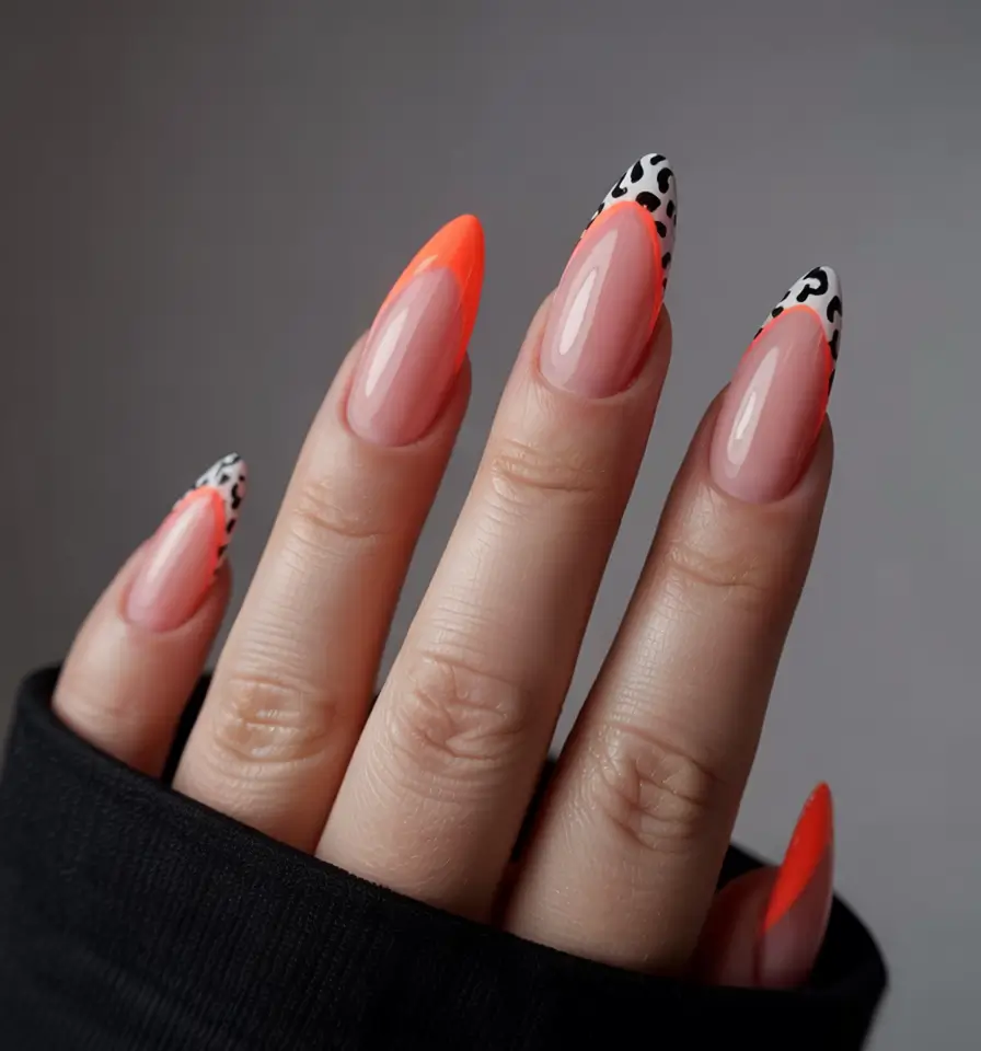 The almond design combines neon orange tips on sheer nude and finishes with black and white leopard spots for a dramatic, high-contrast look. The vibrant color pairing creates an aggressive fashion statement for anyone looking to make an impression. The gel gloss adds depth and shine to the overall design. The 2025 almond nail style provides an edgy summer outfit and a wild nighttime look.