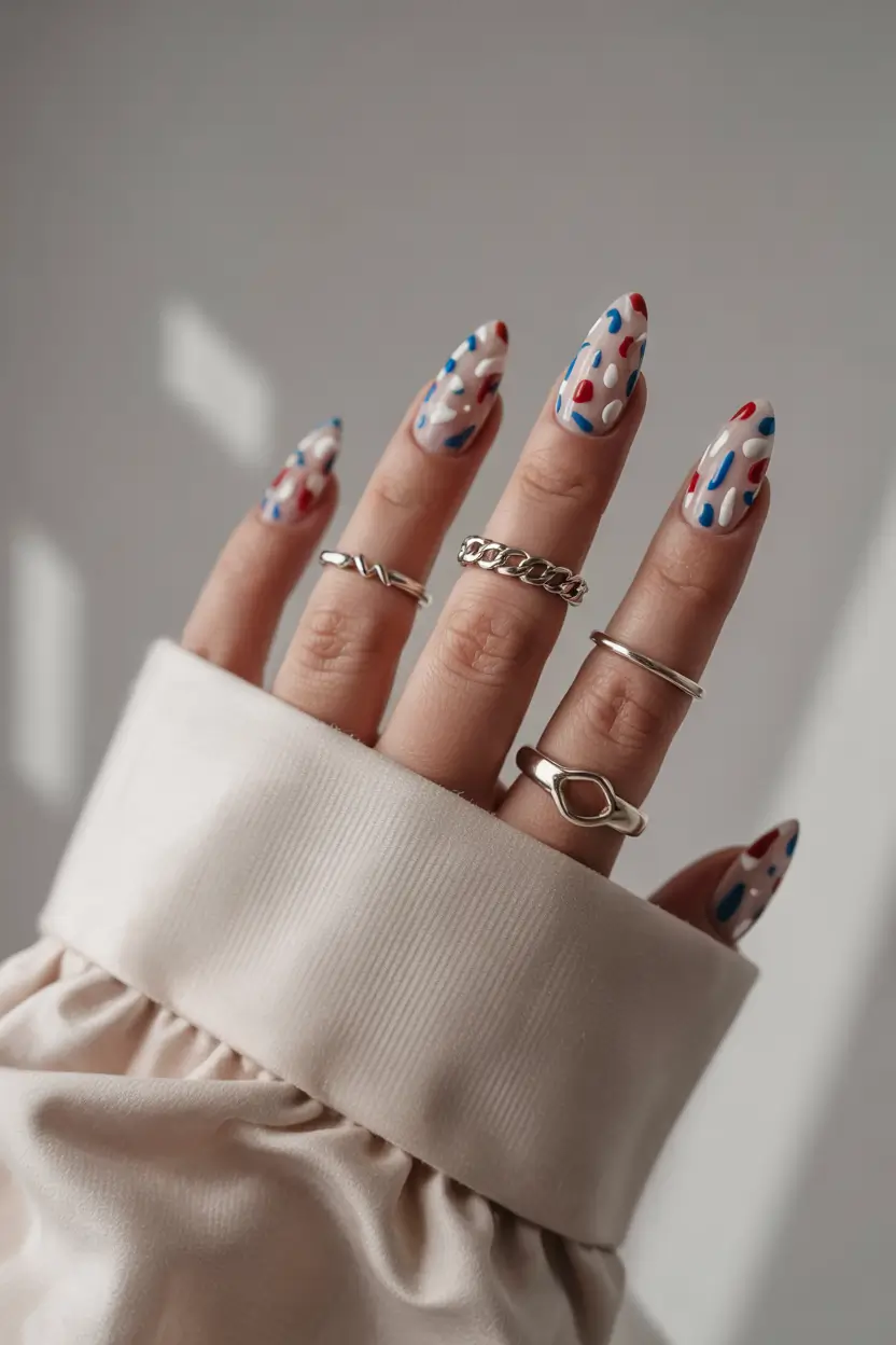 A light neutral gel manicure features scattered decorative elements of blue, red and white 3D dots and dashes over its creamy base. This manicure design features an easy-to-wear, short, simple shape and its high-gloss finish completes a polished look. The abstract art-inspired manicure is a contemporary take on abstract painting and suits people who enjoy visual detail in vibrant color combinations. This manicure style offers energetic artistic elements that work perfectly with any summer ensemble.