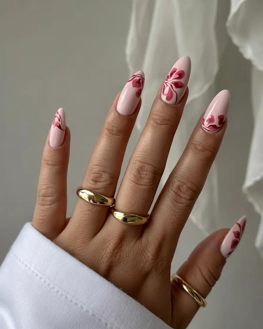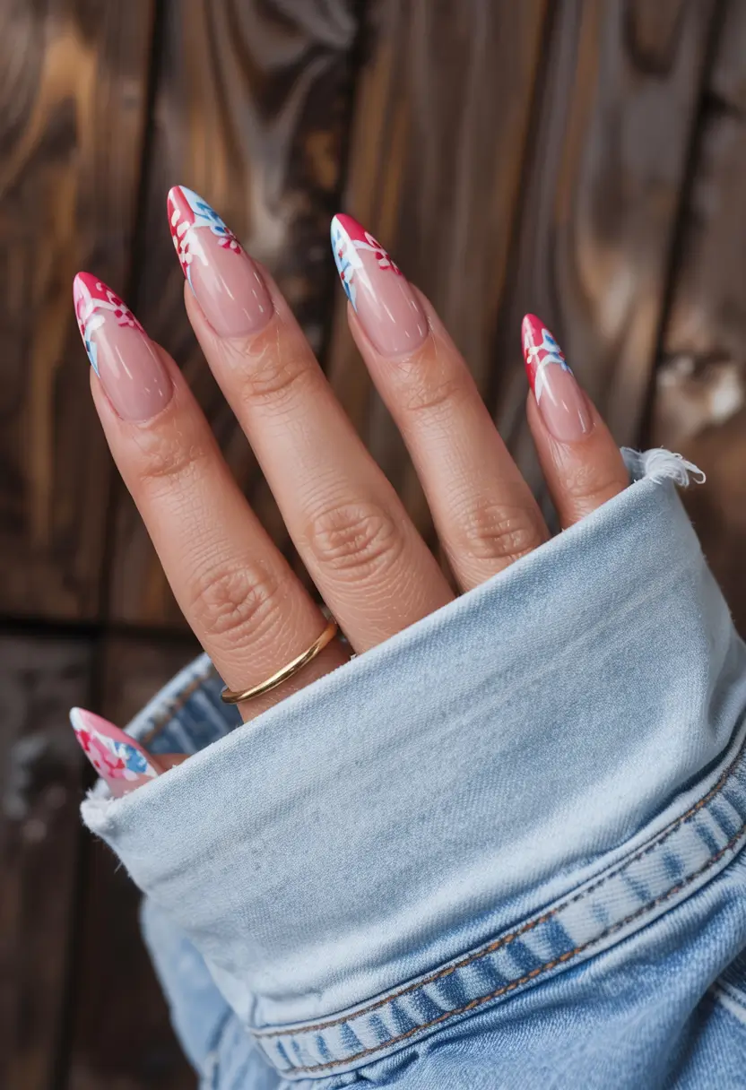 The innovative French Tip technique applies clear base nails along with painted red and blue floral patterns that extend from the tip to almond-shaped nails. The delicate, fine gel lines showcase a polished version of summer flowers for a bold and sophisticated look. This sculpted style in a 2025 almond design is perfect for beach fun or rooftop relaxation. This colorful manicure combination has a charming summer appeal.