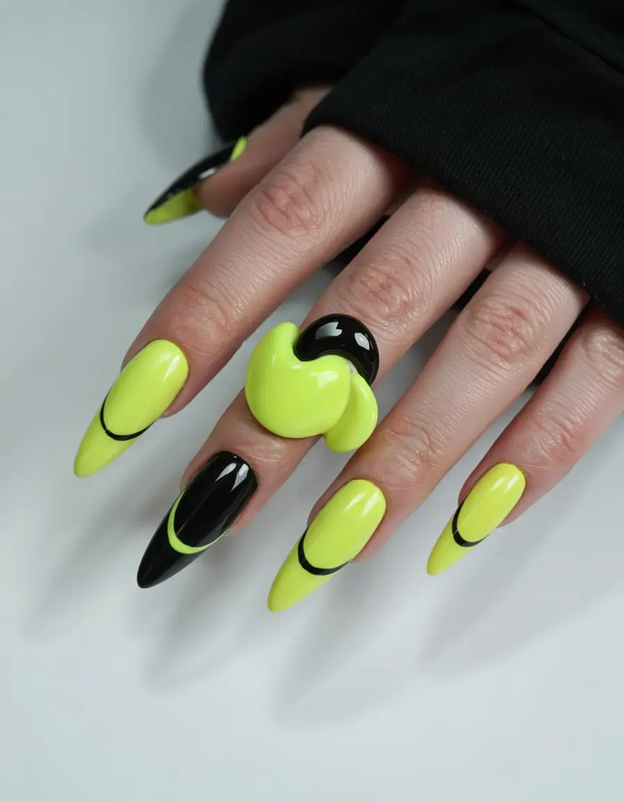 Glossy black paired with high-voltage yellow creates an edgy acrylic design with a yin-yang inspired pattern. In this design, the almond shape controls the overall appeal by keeping it slender, while the 3D accent ring nail serves as a sophisticated focal point. This avant-garde design matches the sci-fi trend of 2025 with its eye-catching style. This creation is the best choice for those who want to make bold statements in their creative nail designs.