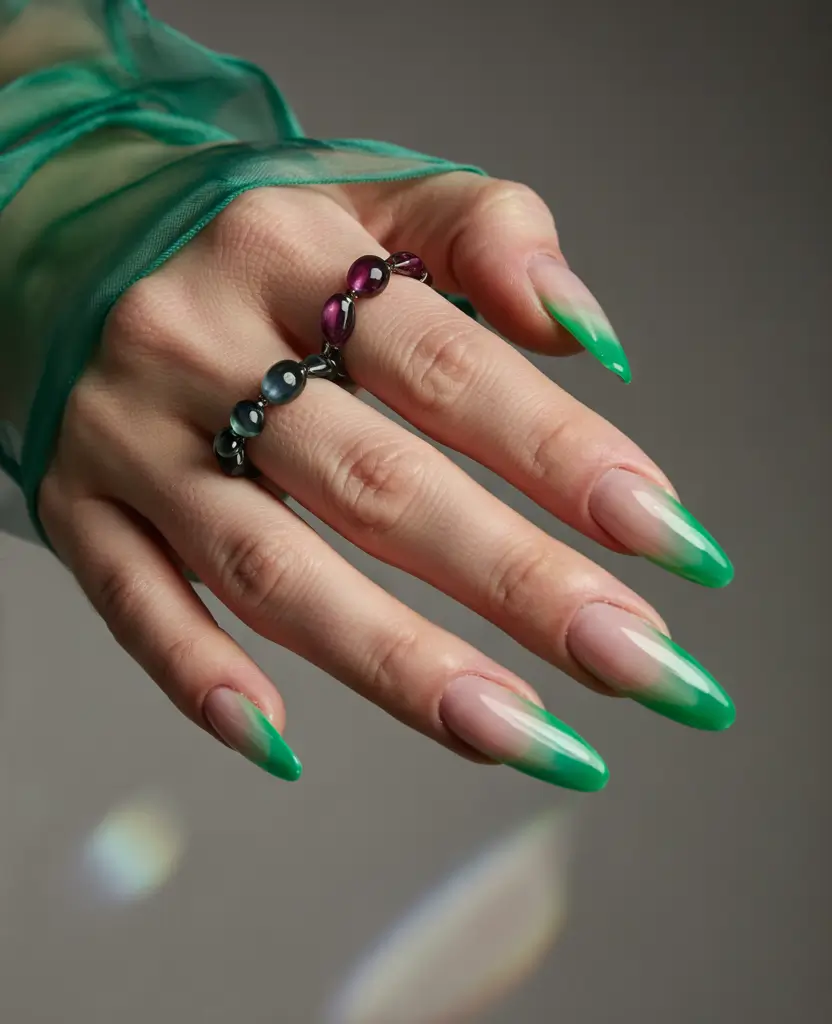 Elegant and soft emerald green lines fade into pale pink tones in this delicate aura-inspired manicure. A seamless transition of the ombre finish creates an elegant nebulous look that looks great on long, almond-shaped nails. This summer nail inspiration for 2025 combines elegance with natural elements to create a subtle and invigorating look. Calm, stylish and effortlessly seasonal.