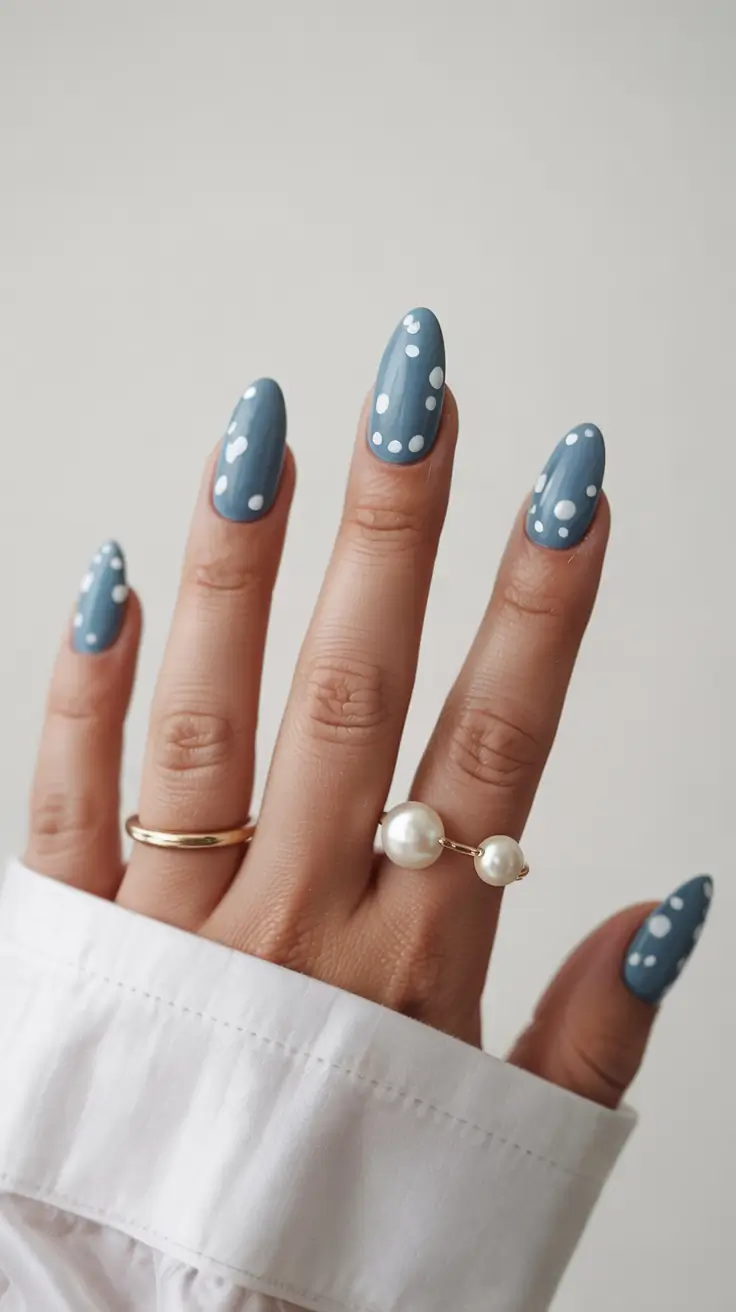 Short, rounded nails take on a retro 2025 short style with a dusty blue matte base combined with clean white polka dot patterns. Hand-dotted gel accents create a cheerful, youthful vibe with an elegant charm. These nails are suitable for casual weekend activities as well as easy coffee dates. The design offers eternal appeal as it blends traditional appeal with contemporary elegance.