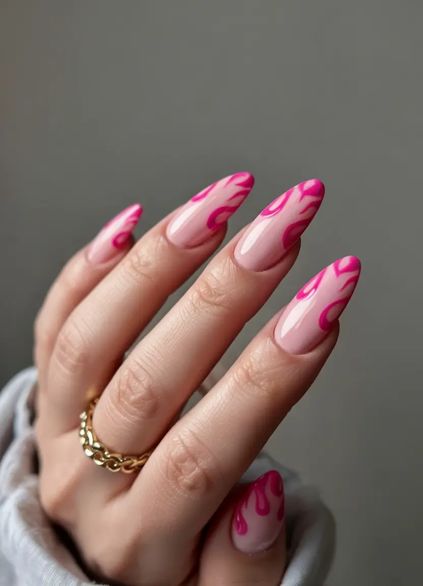 Bold pink flames dance across a nude gel base, creating an eye-catching motif with sweeping lines. The elongated shape of the almond intensifies the design, expressing both fierce and flirty characteristics. The almond short style is well suited for summer evenings and complements the 2025 almond short simple trend. Sleek, shiny and full of attitude.