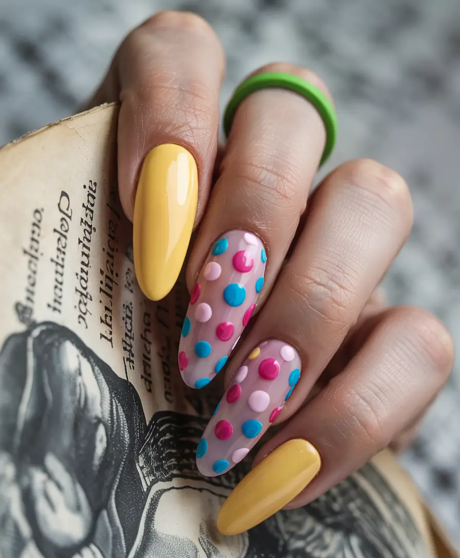 A cheerful 3D polka dot acrylic manicure shines with sunny yellow solids accompanied by playful pink, blue and bubblegum hues. The use of a shiny gel base creates a vibrant textured look that reflects personal dynamics. The 2025 short nail trend gets its retro appeal with this square pop art nail design. The vibrant yellow color with 3D polka dots provides a confident summer vibe that appeals to lively festival crowds and people who want bright energy throughout the day.