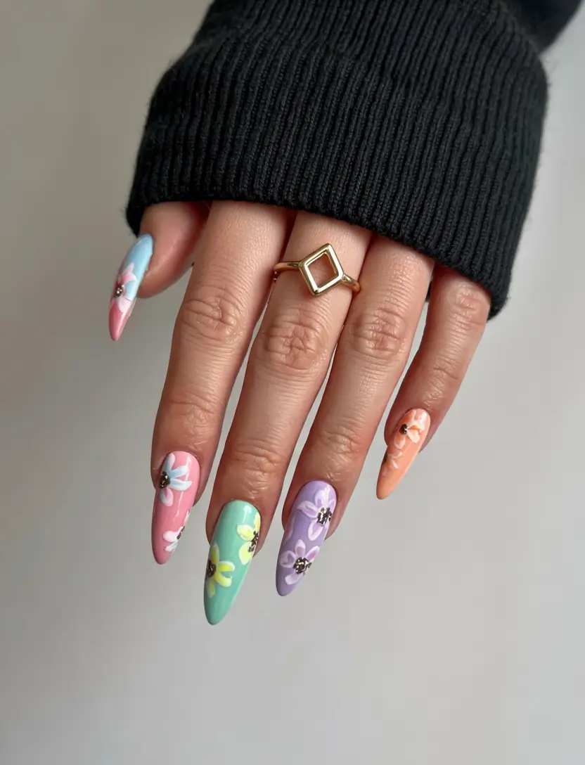 Pastel puppy shades ranging from pink and lavender to peach and mint create delicate flower shapes in full bloom. This almond-shaped design features 3D-crafted petals accented by dazzling embellishments for an appealing depth effect. The assortment of pastel shades in this manicure creates a fresh almond energy that is well suited for the transition from spring to summer. This attractive manicure works well for summer gatherings along with other special events.
