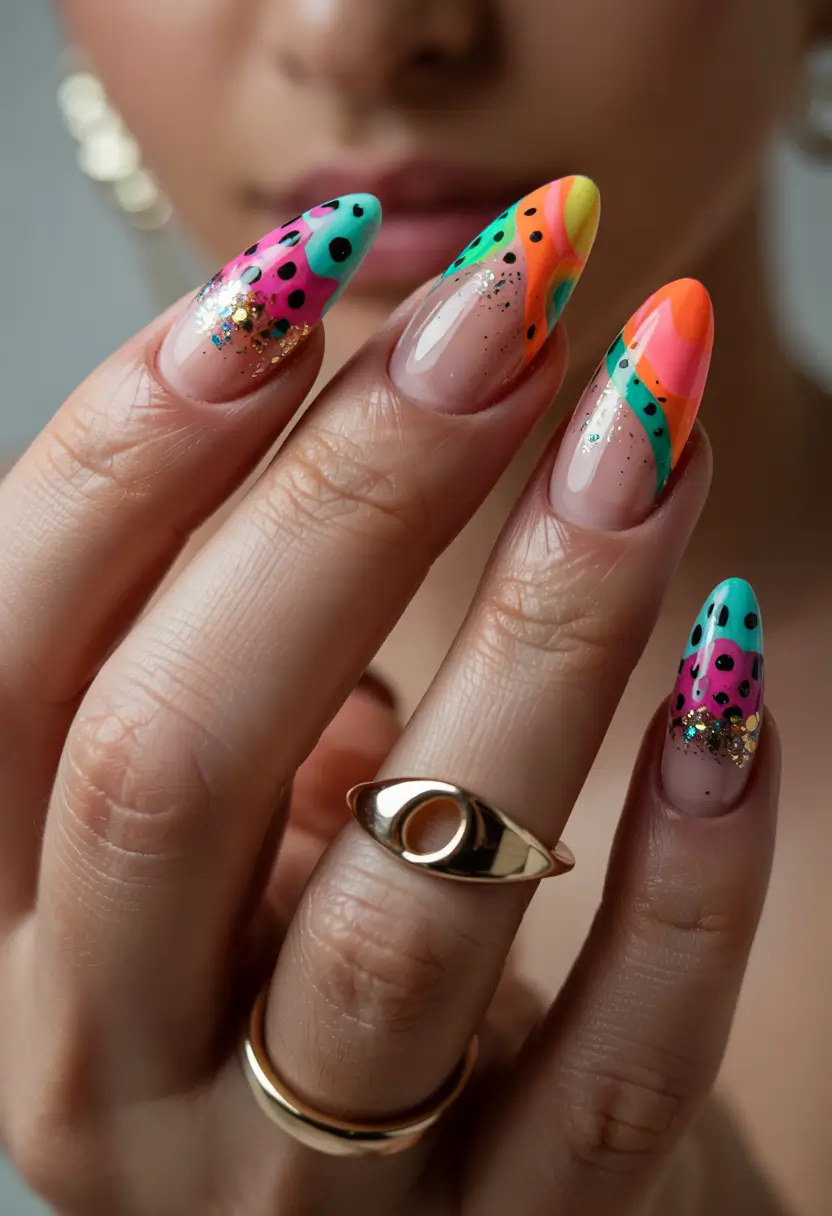 Gel swirls in a colorful mix of blue, orange, yellow and pink create a sharp design over a clear nude base. The playful black dots along with glitter accents create an electrifying 2025 almond design by adding texture and contrast to the almond-shaped nails. This nail design features a high-gloss finish inside the tapered almond shape for an almond-like appearance. This manicure design creates a dramatic summer nail inspiration for 2025 that will impress on any happy occasion.