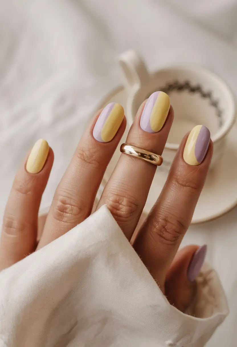 This stylish nail design consists of two clean pastel shades presented in a split pattern that combines muted lavender with soft yellow. People who love modern, minimalist 2025 short styles will find the oval shape an ideal choice. Attractive gel shine gives this elegant nail design an upscale finish that is easy to wear every day. This design represents peaceful equilibrium and works well for summer days that begin slowly or develop into breezy conditions.