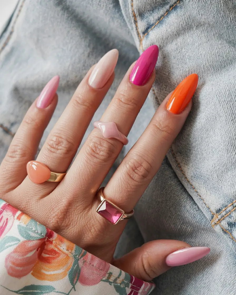 A glossy almond nail design features multiple shades that move through pink and orange colors with precision controls that shape each nail differently in a gradient pattern. These 2025 almond nails have a high-gloss finish that intensifies their shades and provides complete color dominance to stand out brilliantly. People who enjoy modern festivities along with weekend getaways should choose this eye-catching color group. Create an effortlessly elegant look with the intensity of summertime caliente.