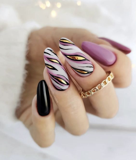 In the realm of nail art, the bold and the baddie often go hand-in-hand, and this trendy design is no exception. Envision your nails as the canvas to a modern artwork blending wild zebra stripes with luxurious gold foil accents. The alternating stripes of black and white dance on the nails with a precision that’s both aesthetic and edgy. The occasional strip of gold adds a touch of bright, trendy sophistication, making these nails a perfect match for a daring summer evening look or a high-fashion event.