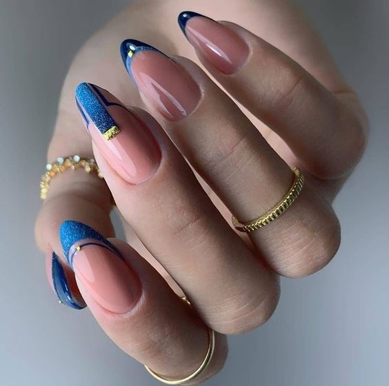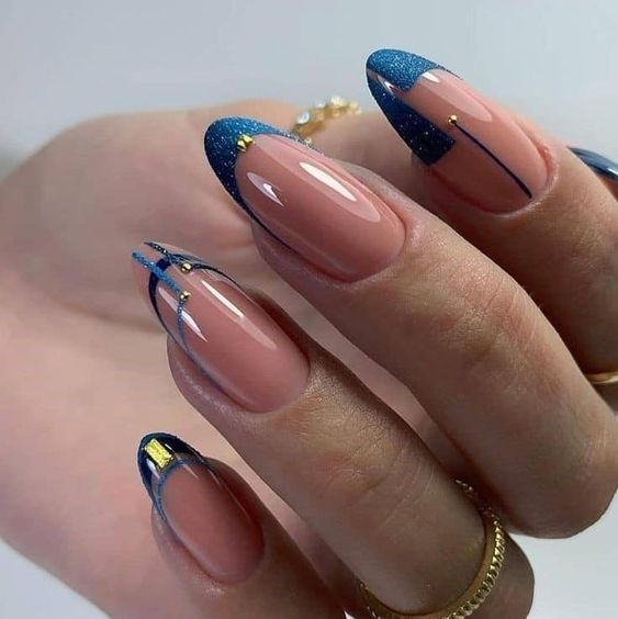 The fusion of navy and gold on almond nails presents a regal look that’s both trendy and timeless. The French tip design is reimagined with a deep blue hue, dusted with glittering gold that adds a celestial touch. Tiny gold studs offer an extra hint of glamour, making these nails a solid choice for an elegant summer evening by the sea or a high-profile networking event. It’s a design that conveys sophistication and a keen fashion sense, ideal for the woman who commands attention with her simple yet bright style.