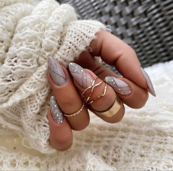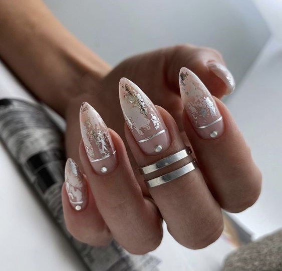 Long almond nails become a masterpiece with an abstract marble design that whispers luxury. The subtle colors of nude and white blend in an ethereal marbling effect, punctuated by tiny pearls and silver accents that elevate the entire look. This design speaks to a simple elegance, one that pairs seamlessly with a sophisticated evening gown or the basic clean lines of a professional ensemble.