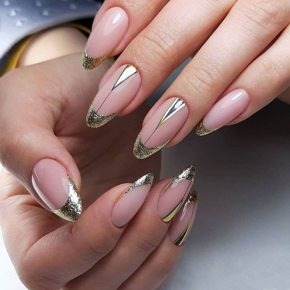 In the constellation of almond nails summer 2024, this design stands out like a starlit sky. The pairing of the glossy nude base with the blue-glittered tips is nothing short of celestial. Accented with a delicate strip of gold, these nails exemplify a trendy yet simple sophistication. They speak to nights filled with shimmering lights and are perfect for adding a touch of glamour to simple short dresses or elevating a basic black jumpsuit.