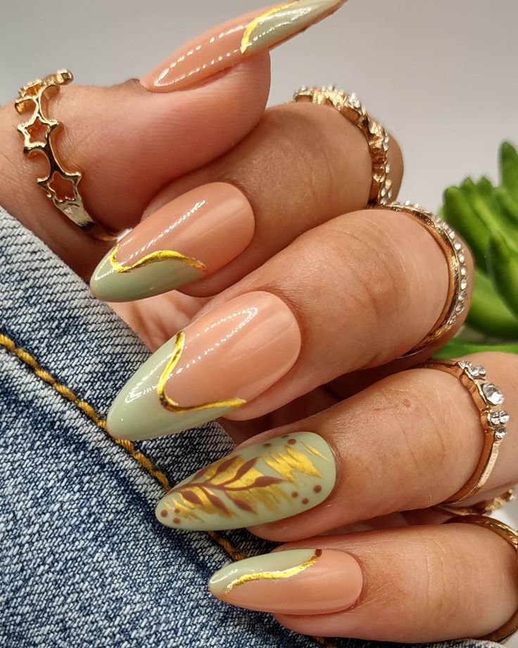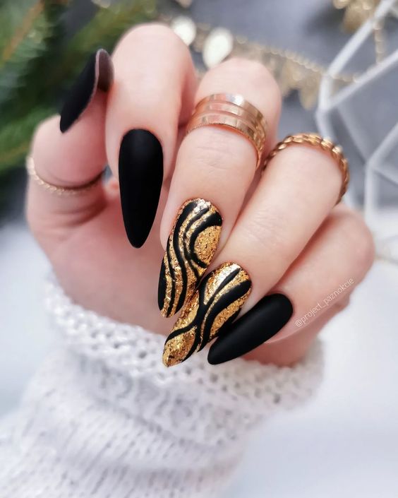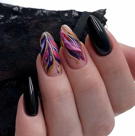 These almond nails are the epitome of dramatic flair, with long black bases that set the stage for a dance of vibrant colors and gold leaf detailing. This design is bold, embodying a baddie and trendy aesthetic that’s perfect for the woman who isn’t afraid to make a statement. It’s a style that could accompany a sleek evening dress or bring an edgy contrast to a bright daytime look.