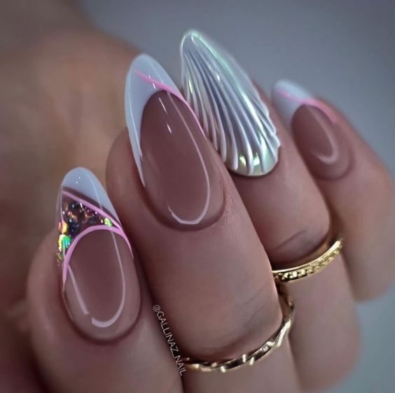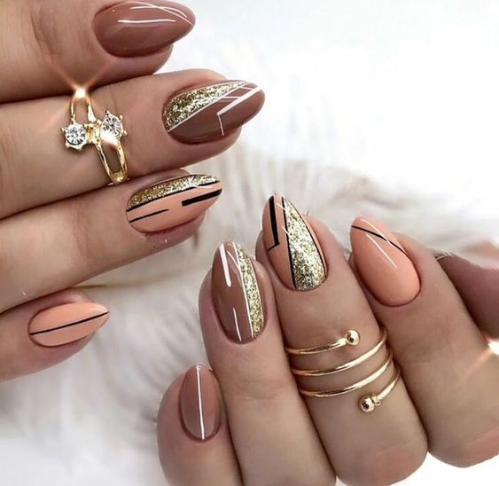 Reflecting the earthy tones of summer 2024, these almond nails in shades of brown and beige are accented with bold lines and a sprinkle of glitter. The look is trendy, aesthetic, and simple, ideal for the woman who loves a basic but refined style. These nails would pair beautifully with gold jewelry and can easily transition from office wear to an evening dinner ensemble.