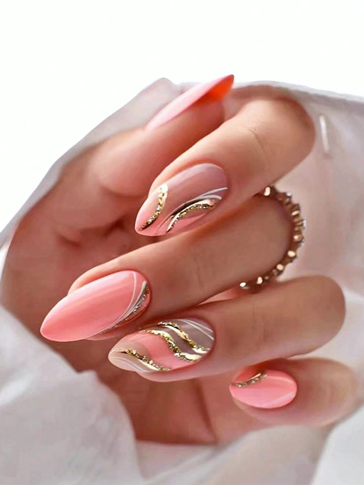 Infused with the colors pink and coral, these almond nails are a soft whisper of summer 2024. The gradient from a gentle pink to a vibrant coral at the tips adds a modern twist to the French tip style. Delicate gold swirls lend an aesthetic appeal, making these nails a cute yet trendy option for any summer day event, from garden parties to bridal showers.