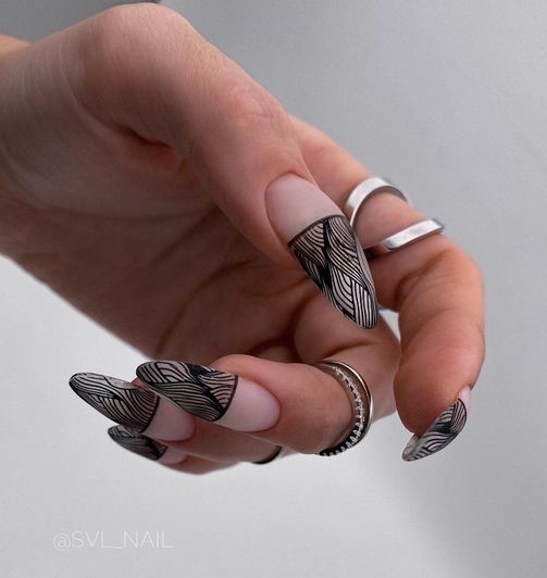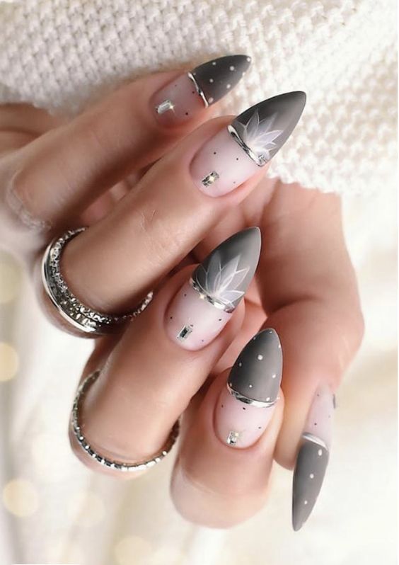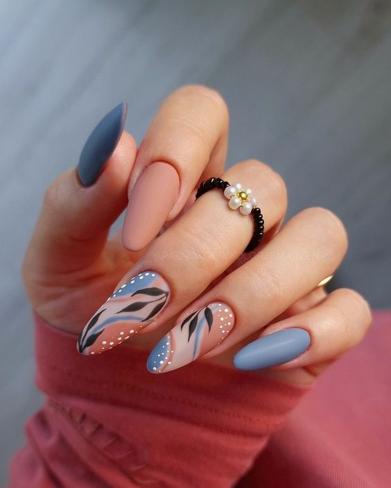 Here’s a nail design that marries the monochrome trend with a touch of botanical grace. The long almond nails are dressed in shades of grey, enhanced with white leaf-like patterns, giving off a baddie yet basic vibe. This trendy choice would be a fabulous addition to a monochromatic outfit or a solid color summer dress, ideal for the fashion-savvy urbanite.