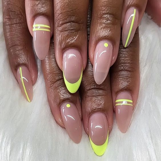 For the daring at heart, these almond nails feature a striking contrast between neon yellow and nude, delivering a bright and trendy statement. The simple design is elevated with a pop of neon at the tips and cuticle, making it a perfect match for the baddie summer look. Pair these with a white tee and denim for a casual outing or a bright neon dress for a night out.