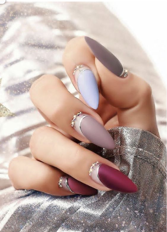 The gradient of soft lavender to rich plum on these almond nails creates a mesmerizing ombre effect. Embellished with delicate jewels, this design is trendy yet simple, exuding a cute and trendy charm. These nails would complement a summer evening gown or add a touch of elegance to a basic daytime look.