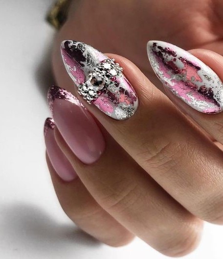 The unique splatter of silver over a soft pink base gives these almond nails a look that’s both trendy and aesthetic. Accented with a three-dimensional jewel, it’s a cute, simple design with a touch of luxury, fitting for a stylish summer 2024. This look would be stunning when paired with metallic accessories or a simple short summer dress.