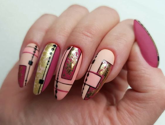 Geometry meets glamour in this exquisite display of golden lines over a solid pink base. The medium length of these almond nails provides the perfect canvas for intricate metallic detailing, creating a simple yet sophisticated look. This design is for the woman who appreciates the artistry in trendy minimalism and would pair well with structured outfits and solid color palettes.