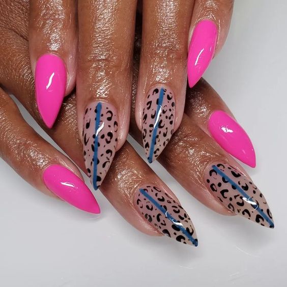 When neon meets animal print, the result is nothing short of spectacular. The bright pink and blue hues set the stage for a leopard print that exudes confidence and charisma. These long almond nails are the epitome of a baddie summer vibe, ideal for the woman who loves to stand out. The trendy mix of colors and patterns makes it a perfect accessory for that bold, statement-making outfit in your wardrobe.