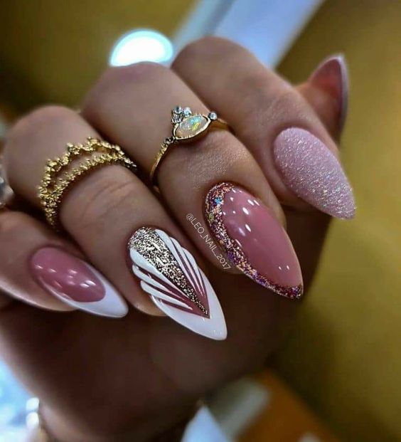 For a touch of romantic allure, the glistening pink and glitter nails are a true expression of femininity. The medium length allows for a versatile wear, while the sparkling glitter and white accents create a French tip illusion with a twist. This trendy design is a match made in heaven for a summer wedding or a fancy cocktail party, promising to add a sprinkle of magic to your overall attire.