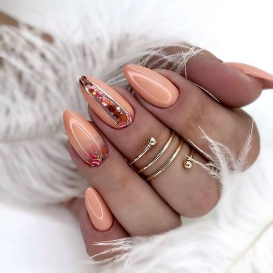 A softer, more simple approach to summer nails can be found in this peach-toned design. Medium in length and simple in execution, the nails are accented with jewel-encrusted features that catch the light and the eye. These almond nails evoke a cute and trendy vibe, perfect for pairing with flowing sundresses or the basic lines of a summer blazer. They’re the ideal choice for a summer’s day outing or a relaxed backyard soirée.