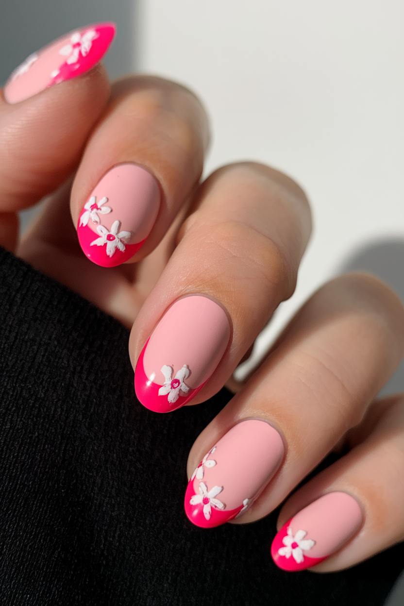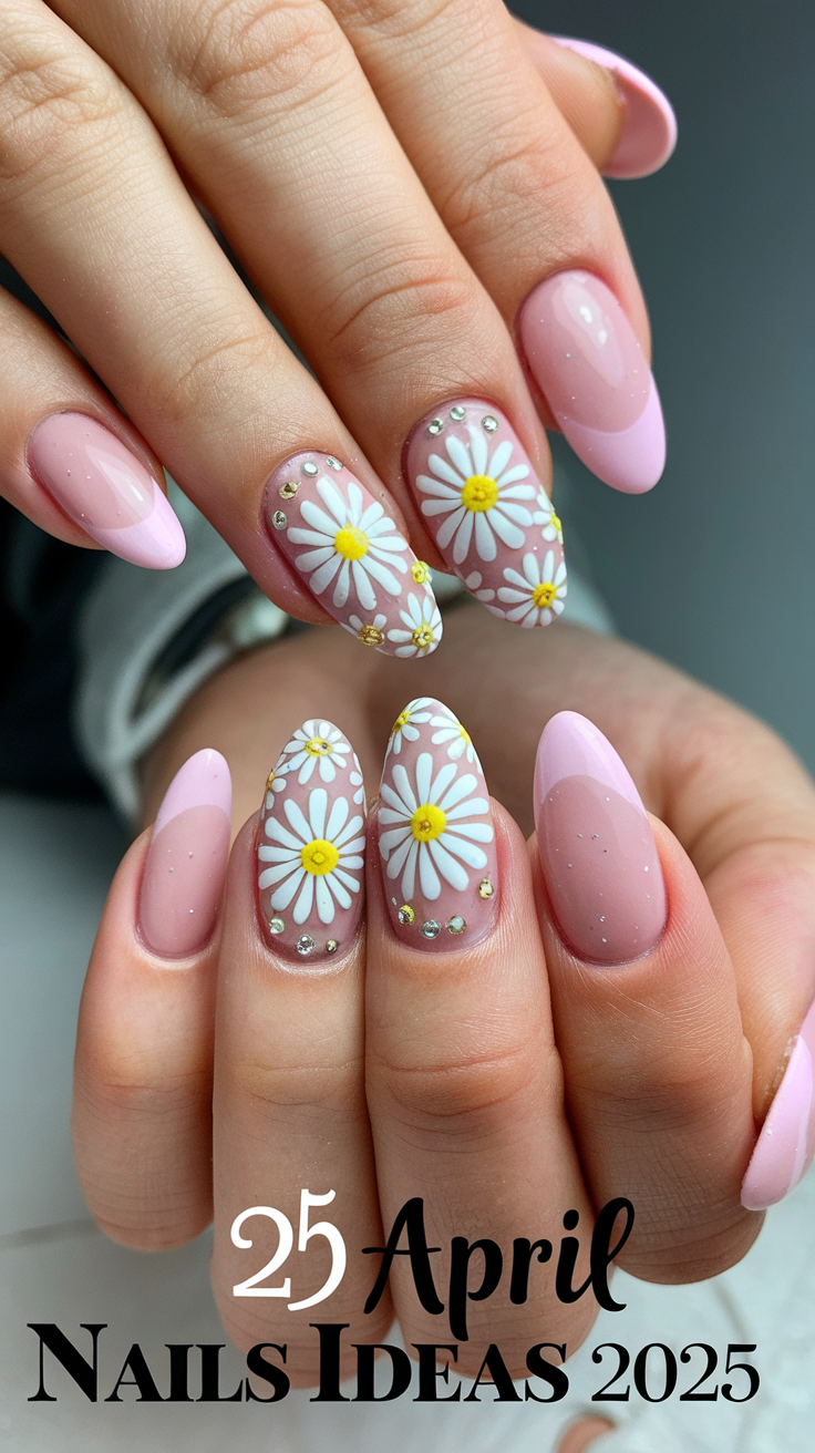 For a chic and minimalistic look, these 2025 short almond nails feature a simple pastel blue French tip against a soft pink base. The accent nails are adorned with delicate white daisies and subtle green stems, adding a refreshing spring vibe. The combination of gel polish and precise detailing ensures a flawless, long-lasting finish. This design is ideal for those seeking April nails ideas 2025 that blend timeless beauty with subtle floral accents.