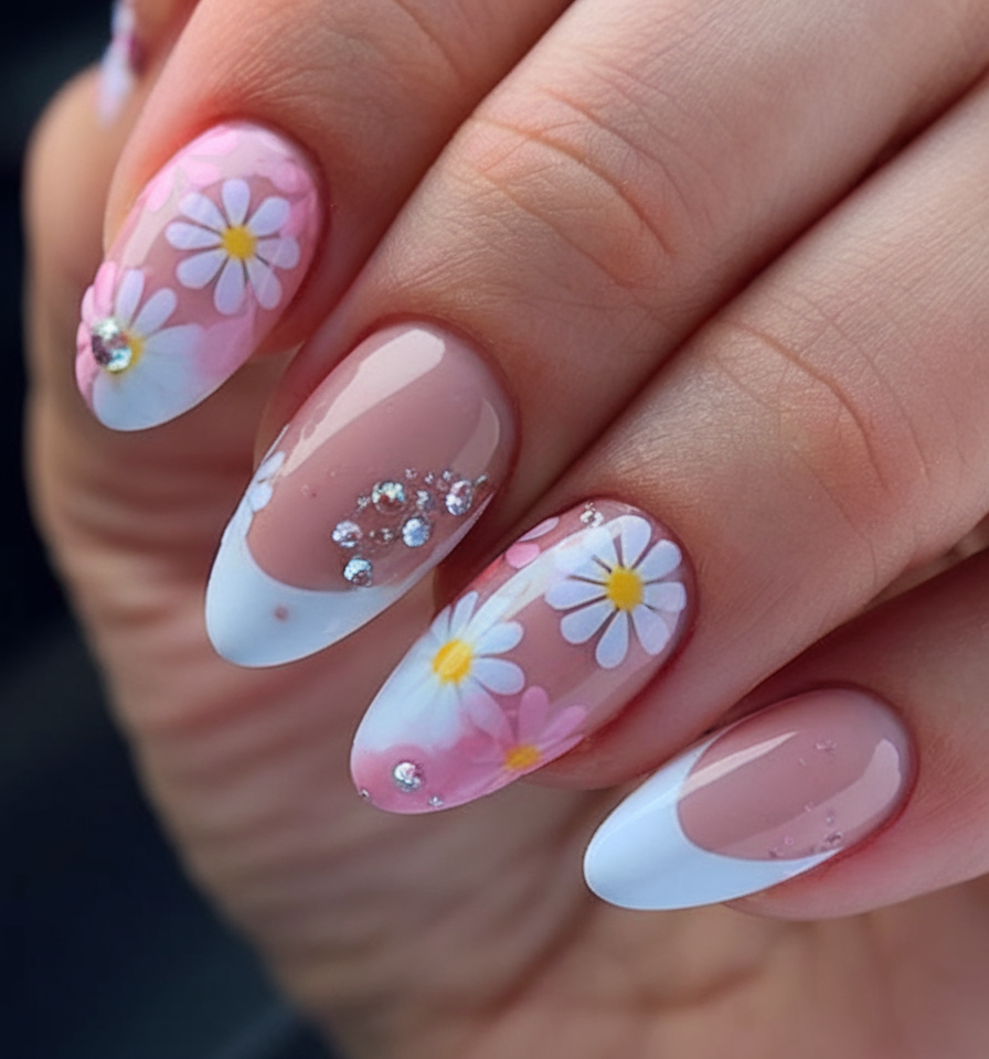 This almond shape manicure combines classic elegance with a modern touch. The simple pink base enhances the crisp white French tips, while delicate hand-painted daisies create a fresh spring feel. A touch of sparkle is added with tiny rhinestones, elevating the look for a refined yet playful style. This design is perfect for those who want a balance of sophistication and seasonal charm in their 2025 almond nails.