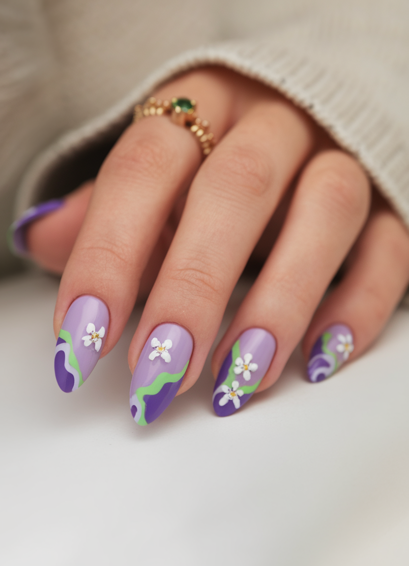 These 2025 almond nails embrace a purple theme with a mix of abstract waves and delicate floral accents. The combination of green and white swirls adds a fresh spring vibe, while the tiny hand-painted flowers bring a soft, feminine touch. The smooth gel finish enhances the color depth, ensuring a polished and lasting look. This manicure is perfect for those who love a modern yet delicate take on April nails ideas 2025.