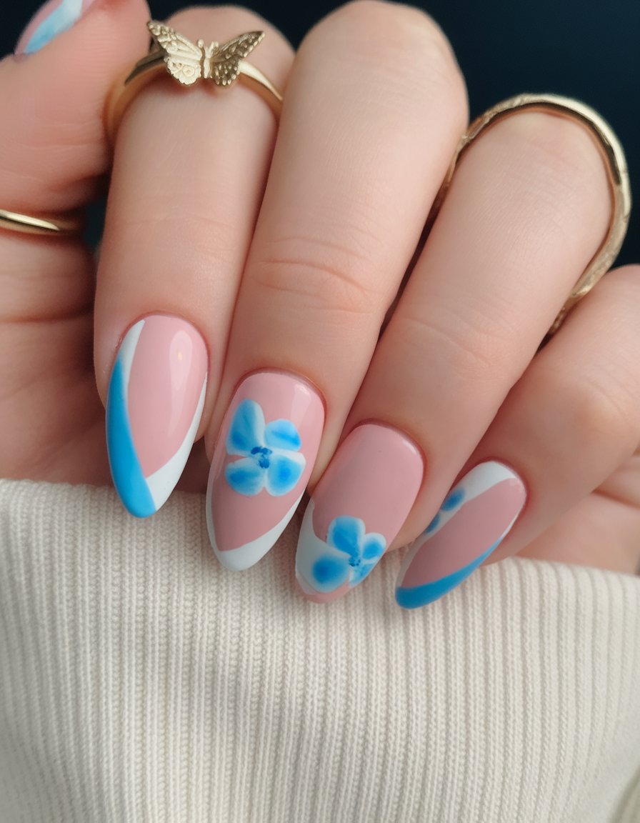 This 2025 almond nail design features a stunning mix of bold floral patterns and a solid deep blue polish. The hand-painted flowers in orange, red, and green contrast beautifully against a soft pink base, creating a lively and artistic effect. The glossy gel finish enhances the vibrancy of the colors, making the design pop. This manicure is a perfect blend of bold and elegant, ideal for April nails ideas 2025.