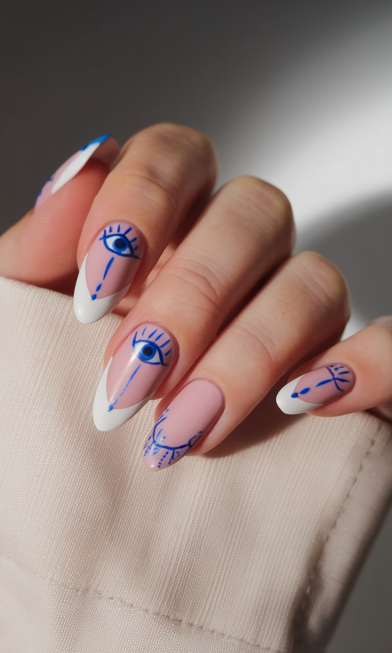 This 2025 almond nail design combines a simple pink base with intricate blue hand-painted eye motifs. The crisp white French tips contrast beautifully, adding a modern and artistic edge to the manicure. The gel polish finish enhances the fine line work, ensuring a smooth and polished look. This unique and trendy design is ideal for those who love creative yet minimalistic April nails ideas 2025.