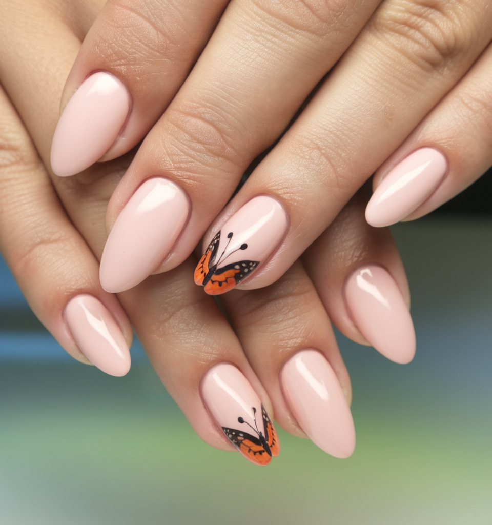 This 2025 almond manicure features a soft pink nude base with a delicate orange and black butterfly accent. The hand-painted wing design on the ring fingers adds a nature-inspired touch, while the glossy gel finish ensures a smooth and refined look. The minimalist style keeps it simple yet sophisticated, making it perfect for everyday wear or Easter celebrations. This April nails ideas 2025 design balances elegance with a hint of creativity.