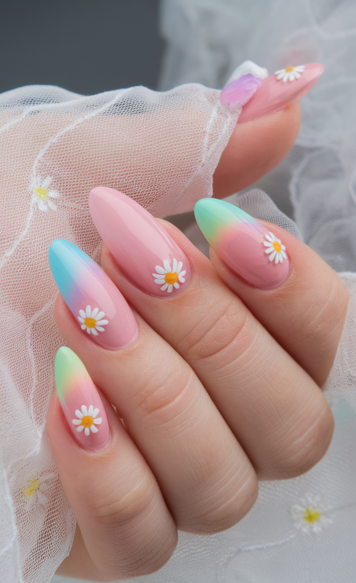 These 2025 simple nails showcase a dreamy pastel ombre blend of pink, blue, and green, creating a soft gradient effect. The addition of hand-painted yellow and white daisy accents adds a playful and feminine charm. The almond shape complements the gentle color transition, giving a fresh and youthful feel. This gel manicure is perfect for those who want a cheerful and delicate April nails ideas 2025 look.