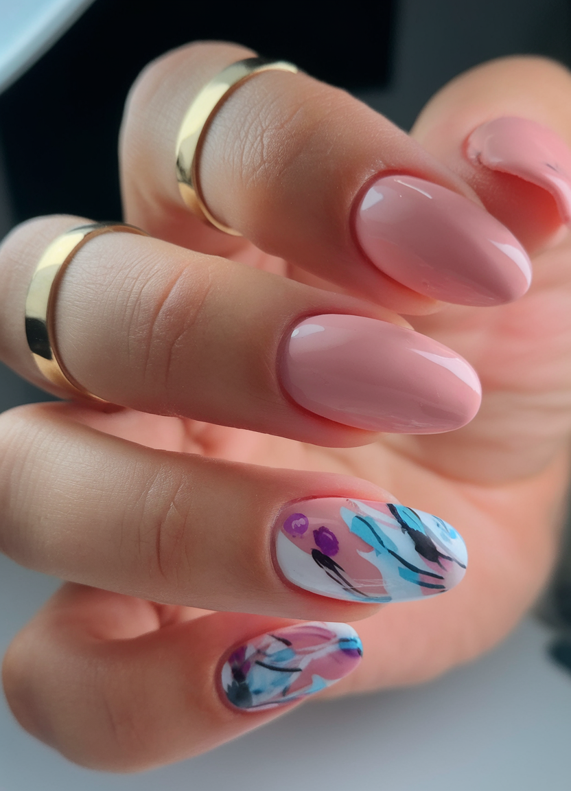 This 2025 short almond nail design keeps it classic with a simple pink base, enhanced by artistic watercolor-inspired accent nails. The abstract floral strokes in blue, purple, and black create a modern, hand-painted effect on a clear and white base. The smooth gel finish enhances the vibrancy of the colors while maintaining a polished look. This chic and creative style is perfect for those who love a unique take on April nails ideas 2025.
