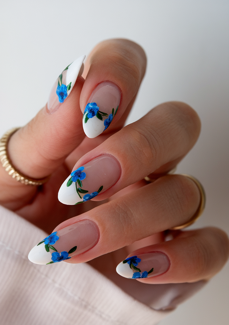 This 2025 almond nail design features a translucent base with crisp white French tips, decorated with hand-painted blue flowers and delicate green leaves. The floral details add a fresh and elegant touch, making it a perfect April nails ideas 2025 choice. The gel polish finish enhances the intricate details and provides a long-lasting glossy effect. This design is ideal for those who love a modern take on a simple yet refined floral manicure.