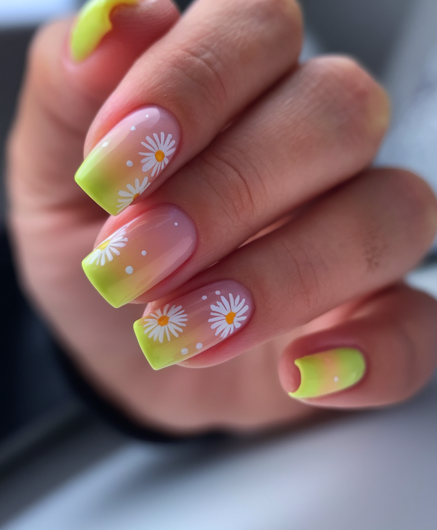 These 2025 short square nails embrace a playful green and yellow ombre effect, creating a bright and cheerful spring-inspired look. The hand-painted white daisies with yellow centers add a fresh and lively feel, making this manicure perfect for Easter celebrations. The gel polish ensures a flawless gradient and a glossy, long-lasting finish. This design is ideal for those looking for a bold yet simple way to incorporate floral elements into their April nails ideas 2025.